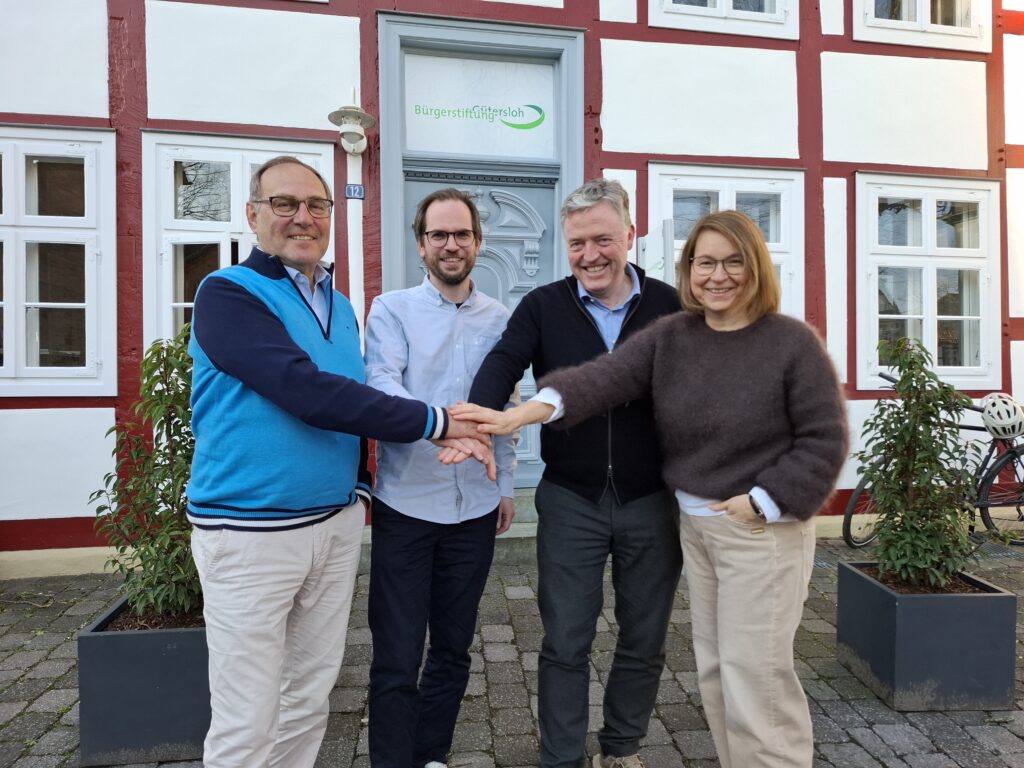 ,,Wir sind Gütersloher durch und durch und dankbar für die Möglichkeiten, die wir in dieser Stadt haben. Daher möchten wir gern etwas zurückgeben.“ Mit diesem Bekenntnis zu ihrer Heimatstadt haben die gebürtigen Avenwedder Andreas Grube und Lars Frenz vom Architekturbüro GJL + Freie Architekten der Bürgerstiftung Gütersloh jetzt eine Spende von 15.000 Euro zukommen lassen. Besiegelt wurde das – wie es sich für echte Ostwestfalen gehört – per Handschlag bei einem Besuch in der Stiftung, wo sich Vorstandsmitglied Rainer Venhaus und Geschäftsführerin Nina Spallek für die erneute großzügige Unterstützung bedankten. Denn das Architekturbüro unterhält bereits seit elf Jahren eine Platin-Patenschaft. „Das zeugt von großem Vertrauen in unsere Arbeit“, betonte Spallek.