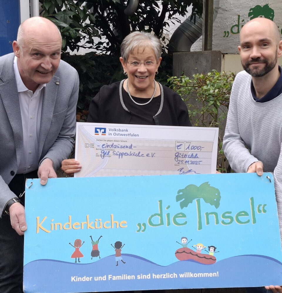 Das Unternehmen Creditreform aus Gütersloh verzichtet seit Jahren darauf, ihren Kunden Weihnachtsgeschenke zu machen. Auch in diesem Jahr spendete die Firma an soziale Einrichtungen in der Stadt und im Kreis Gütersloh. Matthias Bolte, Geschäftsführer und Uwe Wellner, Gebietsverkaufsleiter, besuchten die Kinderküche „Die Insel“ der Gütersloher...