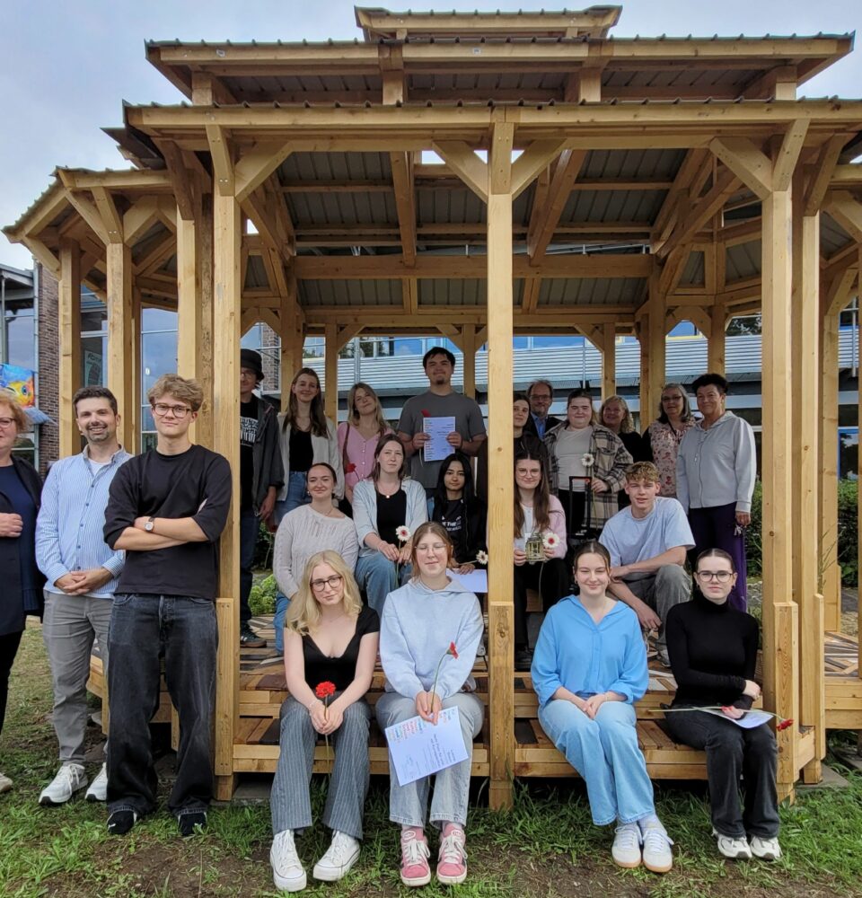 en Mitgliedern des Projektkurses waren Freude und Stolz anzusehen, als der von ihnen geplante und gebaute Kunstpavillon auf dem Gelände der Janusz-Korczak-Gesamtschule (JKG) am vergangenen Montag in großer Runde gefeiert und gewürdigt wurde.
