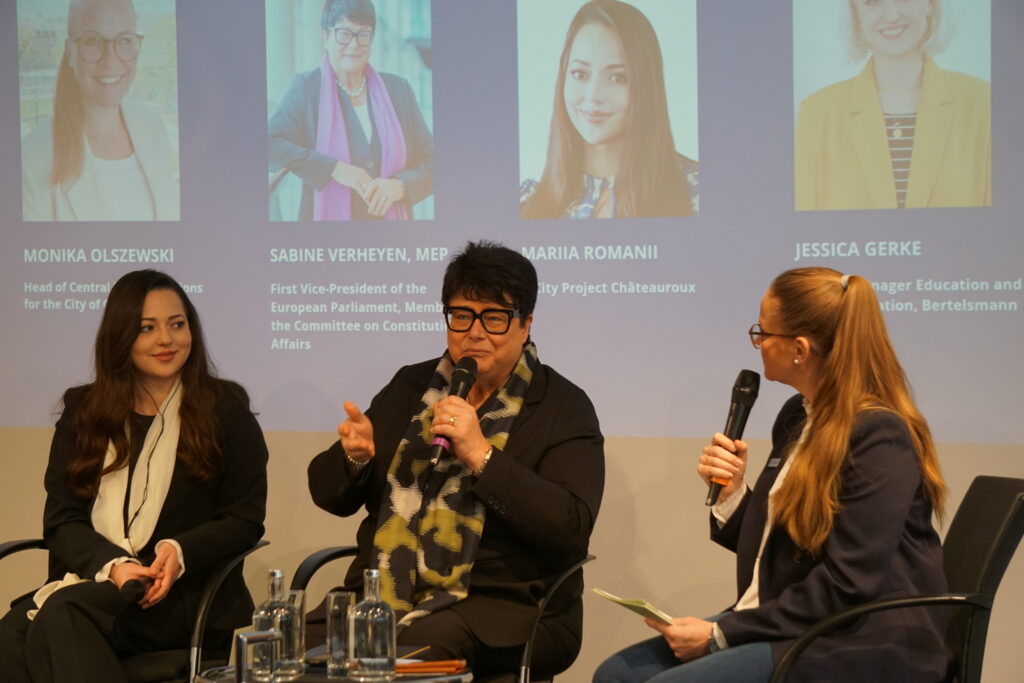 Podiumsdiskussion mit Mariia Romani (Referentin für internationale Beziehungen der Stadt Châteauroux), Sabine Verheyen (Vizepräsidentin des Europäischen Parlaments) und Monika Olszewski (Pressesprecherin der Stadt Gütersloh, Moderation). Foto: Stadt Gütersloh