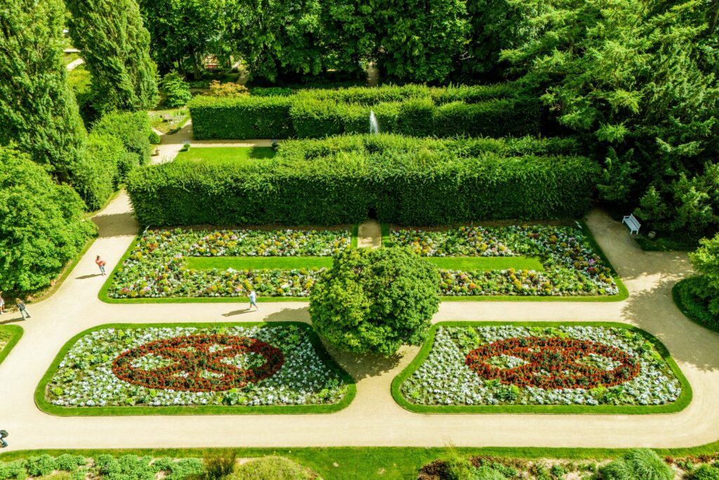 Ein Hingucker im Jubiläumsjahr waren die Sommerbeete im Botanischen Garten. Kein Zufall – sie waren das Ergebnis sorgfältiger Planung des städtischen Fach- bereichs Grünflächen. Rund um den Kugelahorn wurde das Stadtwappen kreativ in wechselseitigen Beeten dargestellt. Die Farben Rot, Grün, Weiß und Silber erzählten so auf blühende Weise „200 Jahre Gütersloh“. Diese kunstvoll gestalteten Beete waren ein lebendiges Symbol für die Verbundenheit mit der Heimat und zogen viele Besucher an, die das einzigartige Arrangement bewunderten