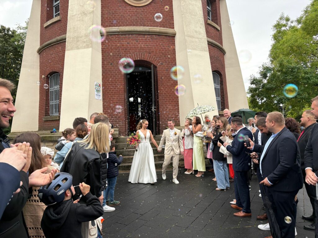 Ein besonderes Ereignis im September war die Eheschließung von fünf Paaren im Gütersloher Wasserturm. Organisiert vom Standesamt, der Gütersloher Bürgerstiftung und der Kreismusikschule, wurde diese außergewöhnliche Location ein symbolischer und feierlicher Ort. Das Ehepaar Tresch feierte anschließend ausgelassen mit Familie und Freunden vor dem