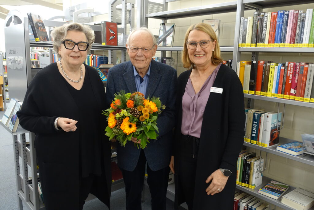 Als Dank überreichte sie Dr. Engelen einige auf seine vielfältigen Interessen zugeschnittene Präsente. Silke Niermann, Geschäftsführerin der Stadtbibliothek Gütersloh, dankte für viele Jahre bereichernder Zusammenarbeit und überraschte ihn mit einem Ehrenmitgliedsausweis der Bibliothek nebst Blumenstrauß.