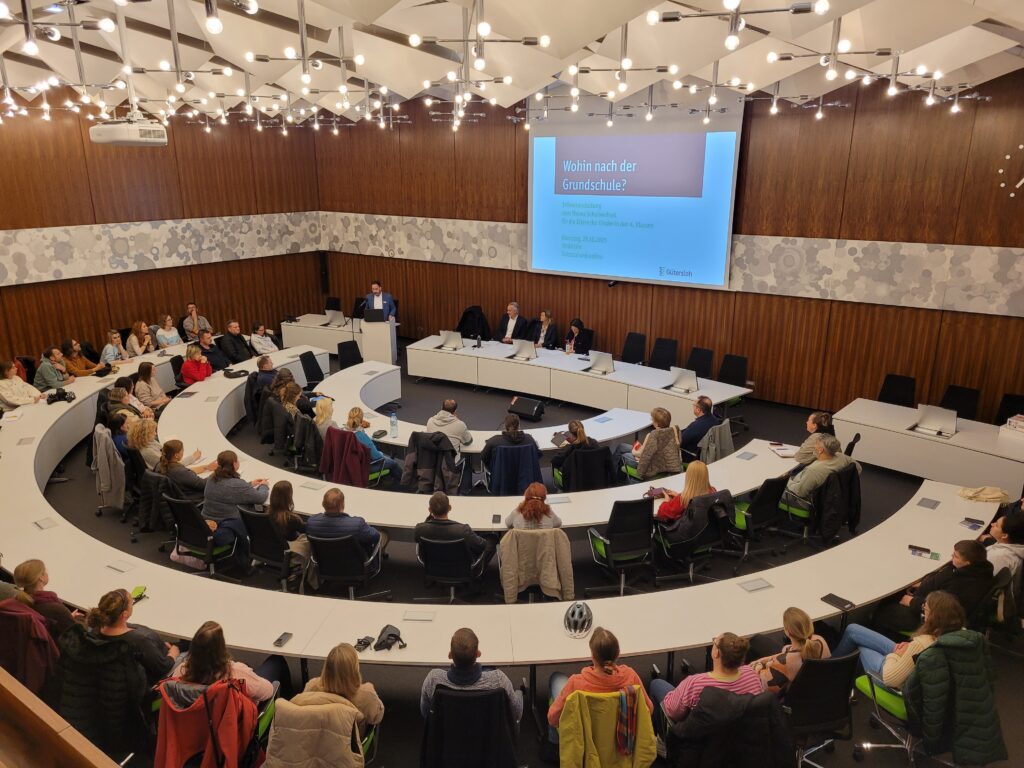 Mit der Wahl der weiterführenden Schule stellen Eltern eine durchaus bedeutende Weiche für ihre Kinder. So verwundert es nicht, dass der Ratssaal bis auf den letzten Platz gefüllt war bei der Infoveranstaltung „Wohin nach der Grundschule?“ am vergangenen Dienstag (28. Oktober), zu der der Fachbereich Schule der Stadt Gütersloh eingeladen hatte. Hinzu kamen rund 200 Menschen, die der Veranstaltung online folgten und per Chat Fragen stellen konnten.