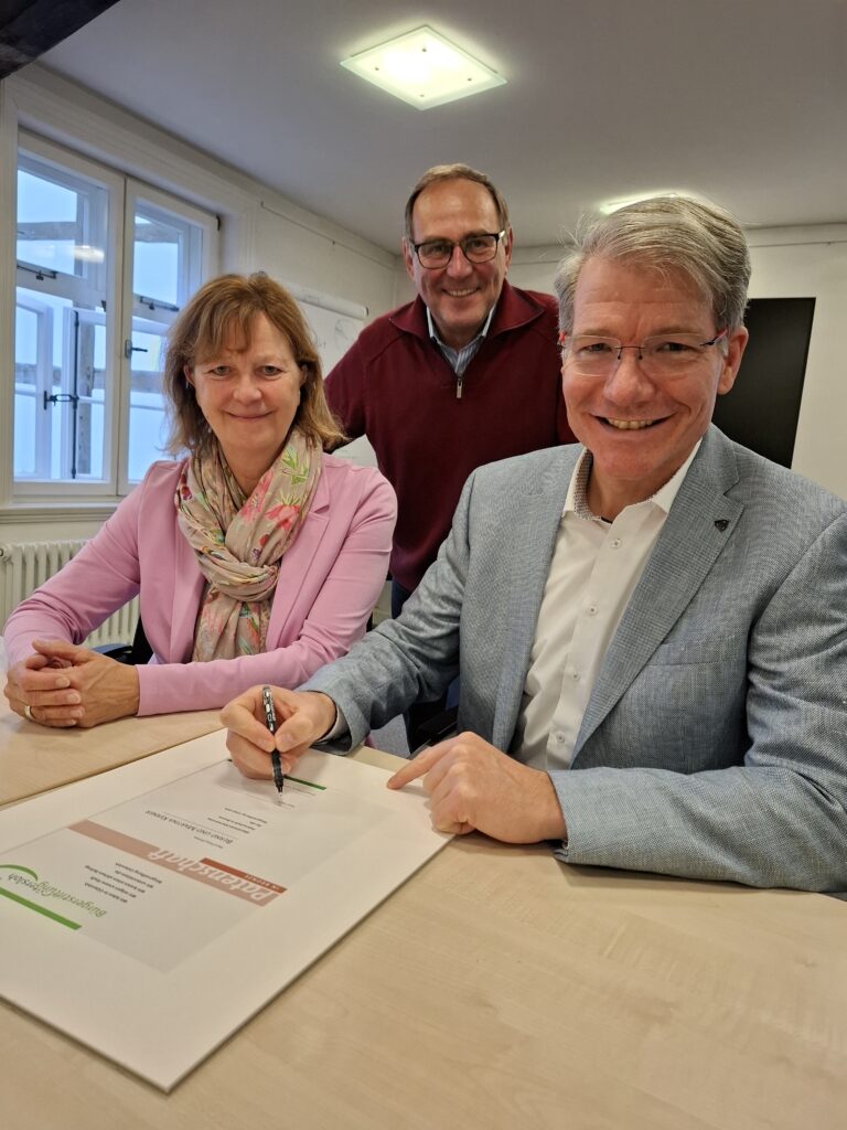 Neu im Kreis der Bürgerstiftungs-Paten: Martina und Bernd Kerner mit Vorstandsmitglied Rainer Venhaus (hinten) bei der Unterzeichnung der Urkunde.