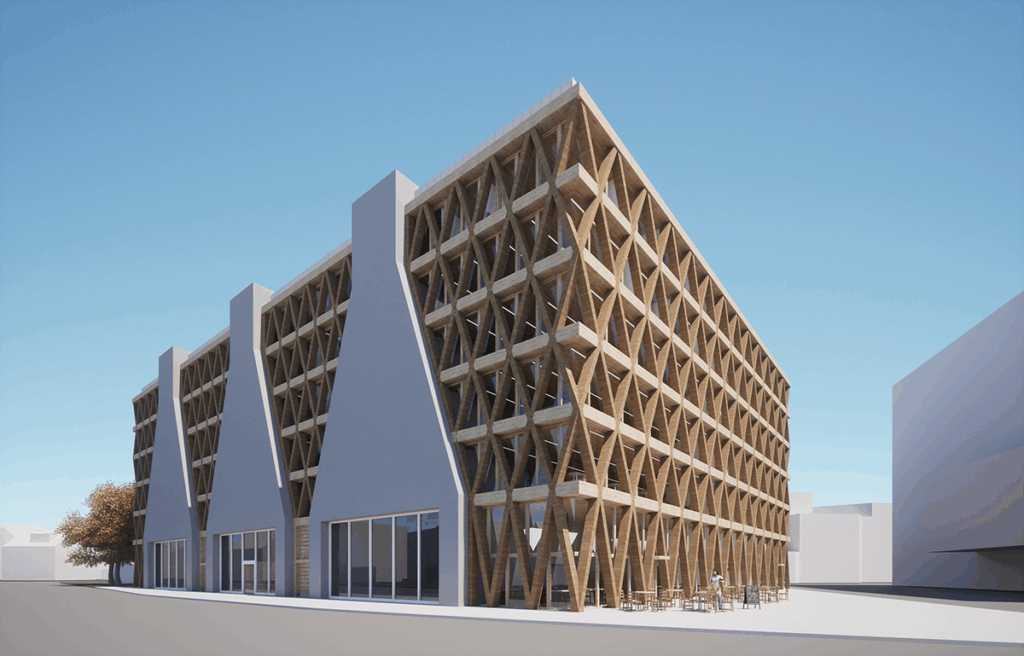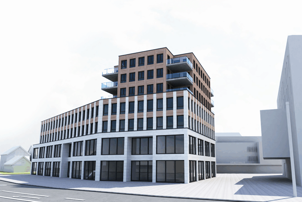 Auszüge aus der Projektbeschreibung: „Die neu zu errichtende Stadtgalerie soll sich durch die Form des Dreiecks von den umgebenden Baukörpern abgrenzen. Der Entwurf arbeitet mit einer engen Verzahnung der unterschiedlichen Nutzungen als Kulturflächen, Büroräumen und dem Wohnen. Drei große Dreiecke aus Beton schieben sich in einen Block aus Holz. Zwischen den mittleren Körpern entstehen zur Belichtung zusätzlich zwei Lichthöfe. Vom 1. OG bis zum 4. OG können Büroflächen vermietet werden. Das 5. OG ist ausschließlich dem gemeinschaftlichen Wohnen vorbehalten. Hier hat jeder Mieter seine eigene Wohnung, zusätzlich gibt es große Gemeinschaftsbereiche, die zum gemeinsamen Kochen und Austausch einladen. Die Dachterrasse ist öffentlich zugänglich und kann u. a. für Veranstaltungen genutzt werden.“