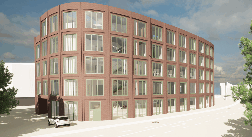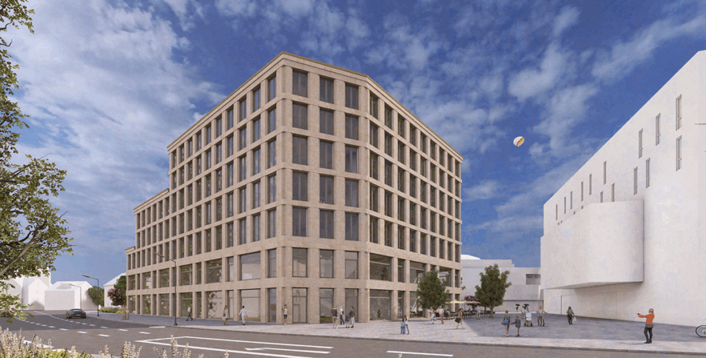 Auszüge aus der Projektbeschreibung: „Die Form des Gebäudes ist das Ergebnis einer Vermittlung: Zwischen der klaren Kubus des Theaters, der amorphen Stadthalle und dem umgebenden städtischen Kontext. Aus dieser Spannung heraus entstand eine weiche, ovale Kubatur – als verbindendes Element, das sich zugleich selbstbewusst positioniert. (….) Die Klinkerfassade mit ihrer tiefen Fensterlaibung interpretiert die regionale Bauweise Güterslohs neu. Im Kontrast zum weißen Theaterbau setzt das Gebäude mit grünen Fensterrahmen einen modernen, lebendigen Akzent. Im Erdgeschoss öffnet sich eine frei zugängliche Galerie lokalen Künstler:innen. Ein Ort zur Begegnung, niederschwellig und kuratiert mit Blick auf die Vielfalt der Stadt. Im Geschoss darüber hat das stadthistorische Museum seinen Raum. Die Erschließung erfolgt über die Galerie – eine bewusste Verbindung von Gegenwart und Vergangenheit. Das zweite Obergeschoss bietet flexible Büroflächen … darüber folgt eine Etage mit möblierten Kurzzeitwohnungen, angelehnt an das Stayery-Konzept. Ganz oben: großzügige Wohnungen mit Dachterrassen und Ausblicken über Theater, Stadthalle und den ruhigen Innenhof, der als Lichthof ab dem zweiten Obergeschoss beginnt.“